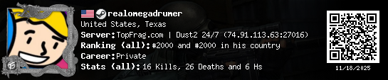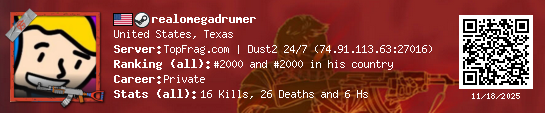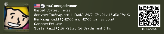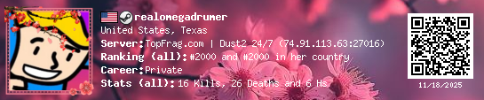 [url=https://topfrag.com/shop/playerinfo.php?id_profile=27009&id_server=1][img]https://topfrag.com/shop/signature.php?id_profile=27009&id_server=1&theme=1[/img][/url]
