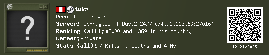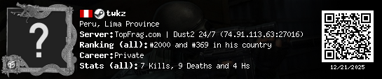 12/21/2025 - 7:23 PM Peru de_dust2_snow 1 (1) 5 (1) 1 0.15 h