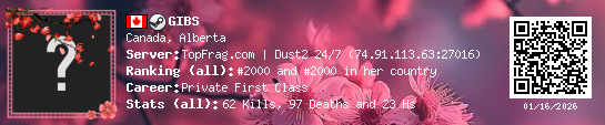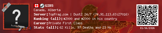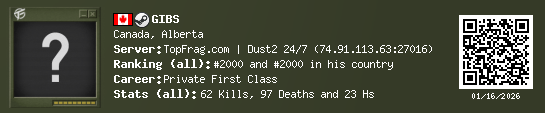 01/15/2026 - 1:09 AM Canada de_dust2 16 (5) 21 (0) 5 0.64 h