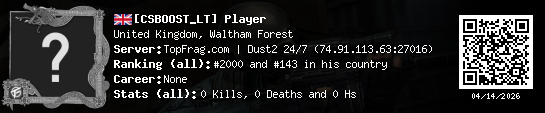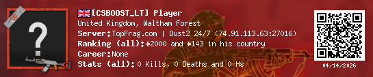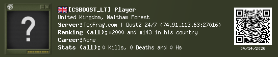 03/16/2026 - 10:56 AM United Kingdom de_dust2 0 (0) 0 (0) 0 0 h