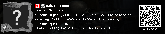 03/17/2026 - 11:36 PM Canada de_dust2 5 (1) 13 (0) 1 0.37 h