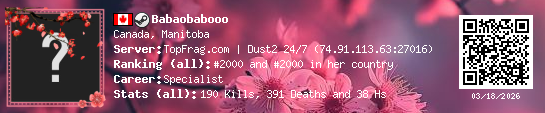 03/18/2026 - 6:27 PM Canada de_dust2 6 (2) 11 (0) 1 0.3 h