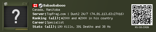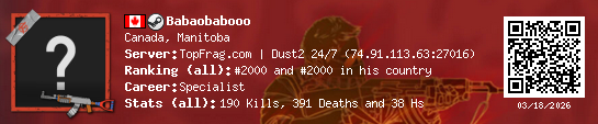 03/18/2026 - 5:06 PM Canada de_dust2 7 (2) 18 (0) 0 0.42 h